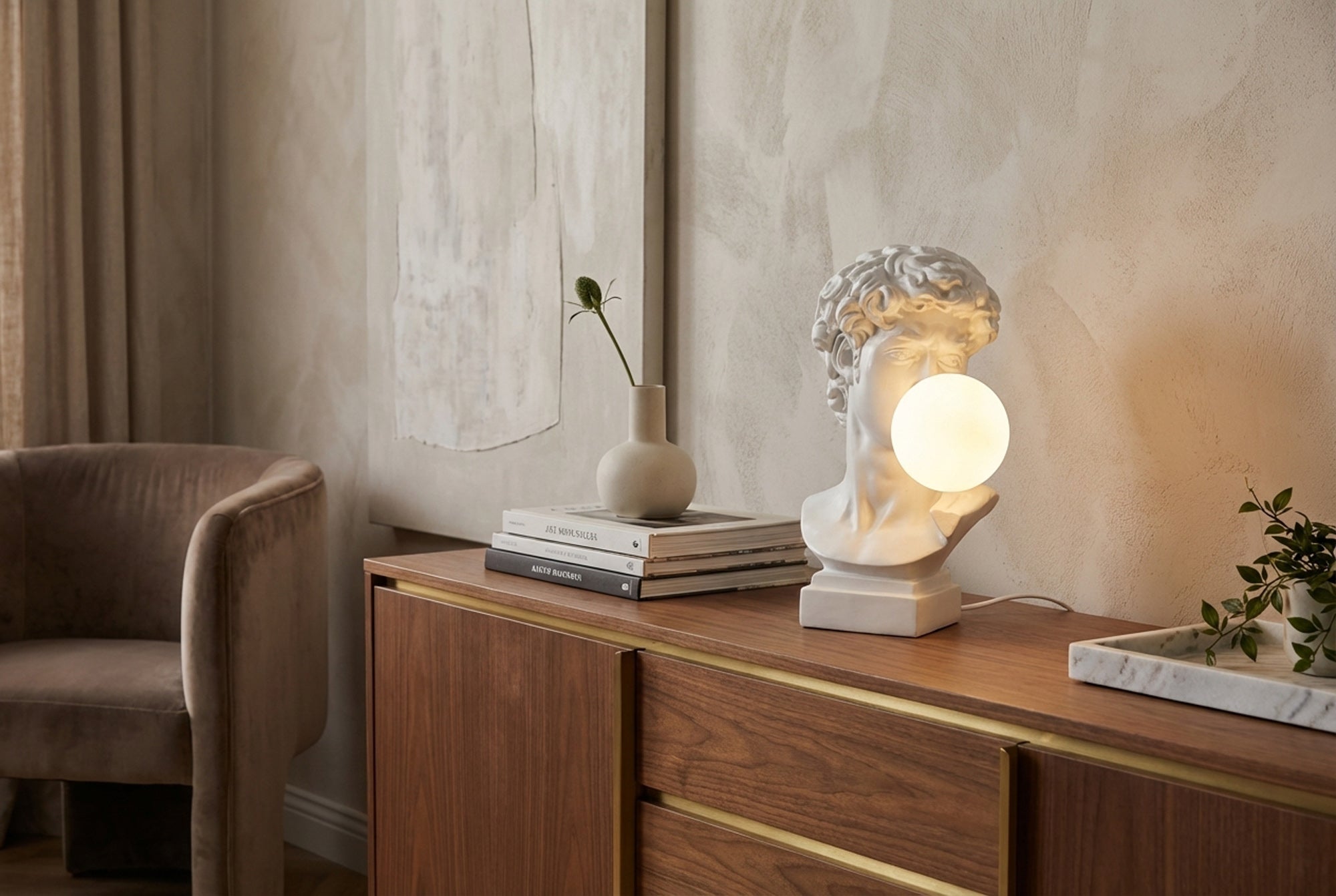 Bring a touch of classical elegance to your interiors with the Table lamp DAVID, featuring a handcrafted white polyresin bust topped with a sleek lamp globe. Blending artistic sophistication with practical lighting, this unique piece adds warmth, style, and Renaissance flair to any desk, sideboard, or bedside table.